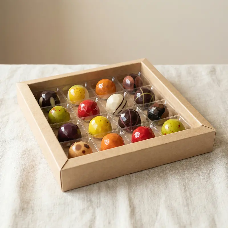Caja 16 bombones Selección del Chef artesanos creados en pequeñas tandas con los mejores ingredientes naturales, orgánicos y de comercio justo, sin lactosa, sin gluten.